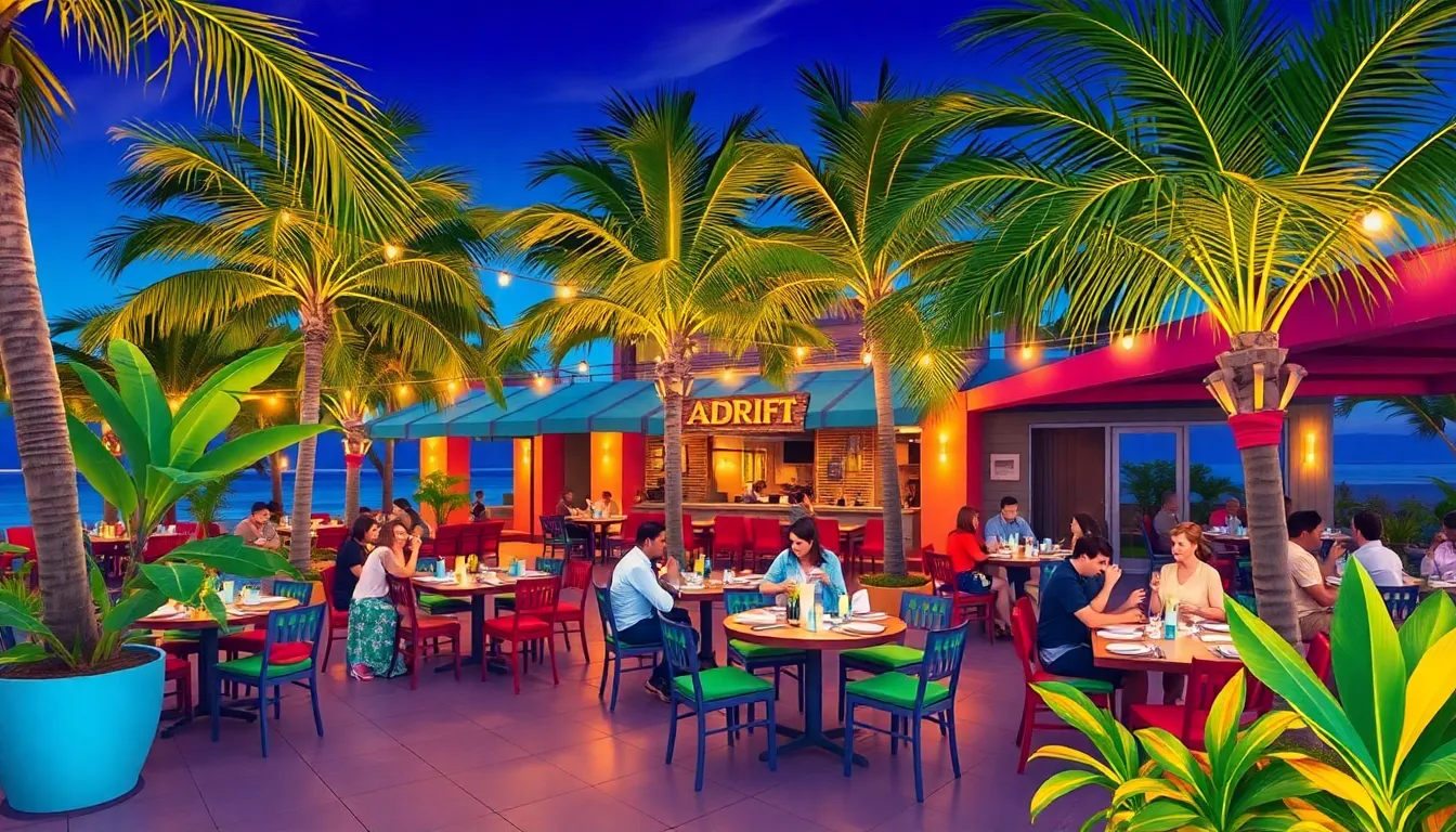 Adrift Restaurant delivers a vibrant dining experience with its captivating location and inviting ambiance. Guests enjoy a lively atmosphere that reflects the restaurant’s tropical theme.